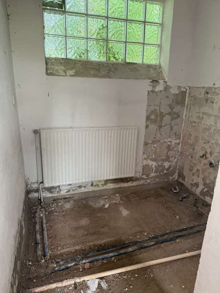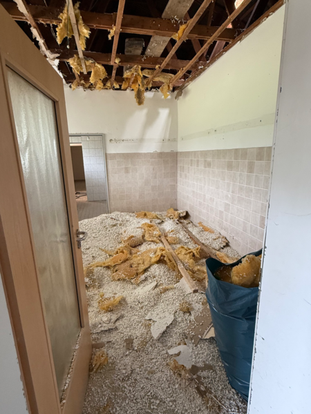 werden die Fliesen abgestemmt, die persönlichen Gegenstände aus den Räumen entfernt und der Bereich kernsaniert. Die Heizung wird verlegt (keine