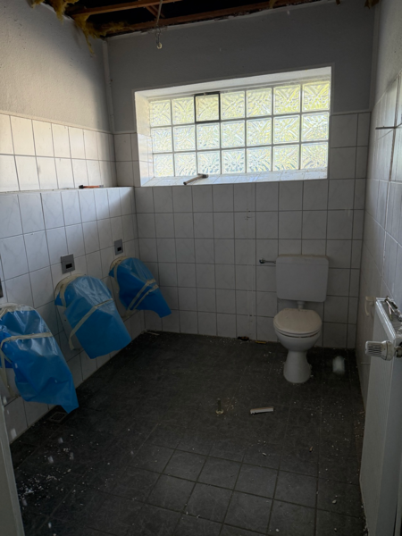 - sämtliche Kabinen ausgeräumt, Fliesen und Estrich bis auf die Bodenplatte heruntergestemmt.