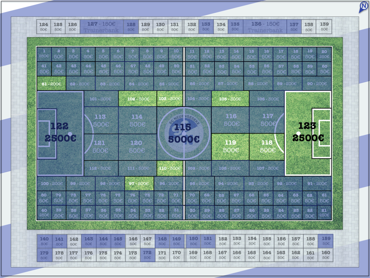 Die Legende von Neuengeseke steht zwar jeden zweiten Samstag im Clubheim 2:0 (vorbeikommen!!!) hinter der Theke, hier meinen wir aber die Übersicht, welche Parzelle du zu welcher Spende erspenden kannst.