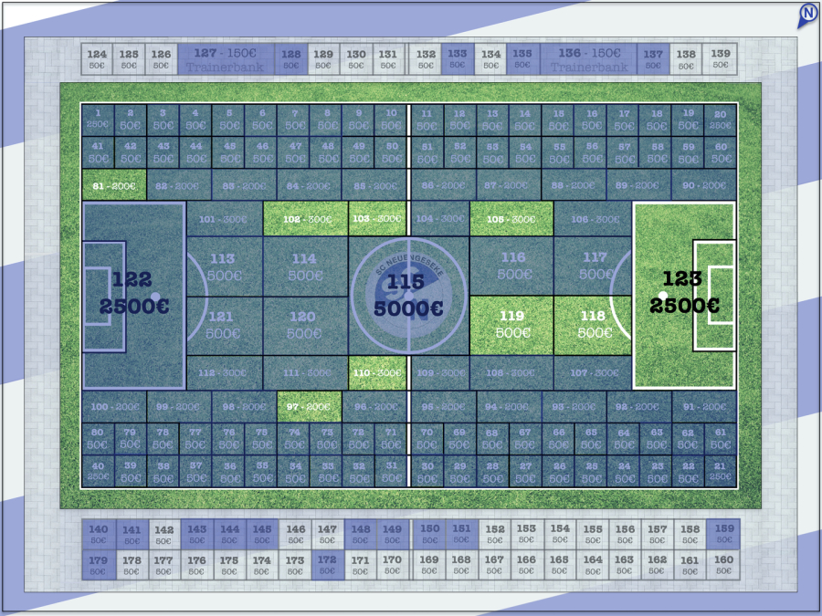 Hier unten drunter findest du eine Karte mit aufegteilten Parzellen des neuen Kunstrasenplatzes, unter dieser Karte findest du die Legende!