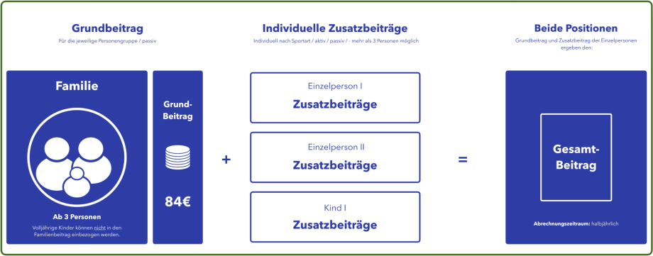 Hier findest du die Beiträge für Famileien (ab 3 Personen). Die Beiträge ergeben sich aus einem Grundbeitrag (84€ - für die gesamte Familie) und einem individuellen Zusatzbeitrag der jeweiligen Familienmitglieder, welcher sich aus der Sportart ergibt, an derer sie aktiv teilnehmen.