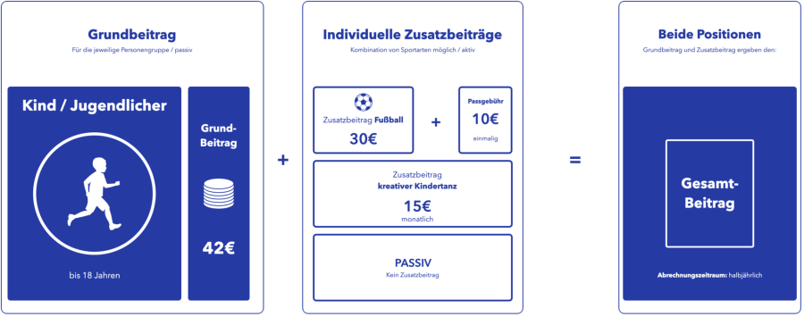 Hier findest du die Beiträge für Kinder und Jugendlich (bis 18 Jahren). Die Beiträge ergeben sich aus einem Grundbeitrag (42€ - dieser ist für alle Mitglieder der Personengruppe gleich) und einem individuellen Zusatzbeitrag.
